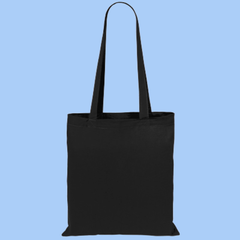 Bolsa de algodón 100%, 105g/m2, disponible en color negro con acabado cosido, personalizada en un lado, estampación digital de alta calidad.