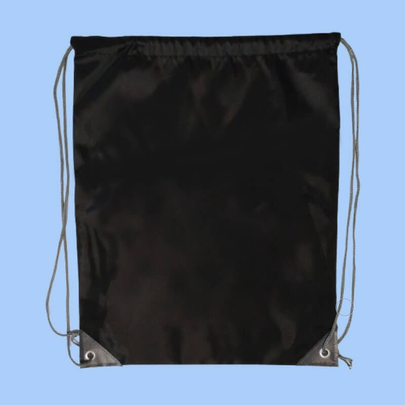Mochila de cuerdas de color negro, material poliéster (210D), bolsillo frontal con cremallera y salida de auriculares. Cuerdas de autocierre en color gris, a juego con cremallera y esquinas con argollas metálicas y refuerzo de polipiel. Mochila personalizada en un lado, estampación digital de alta calidad.